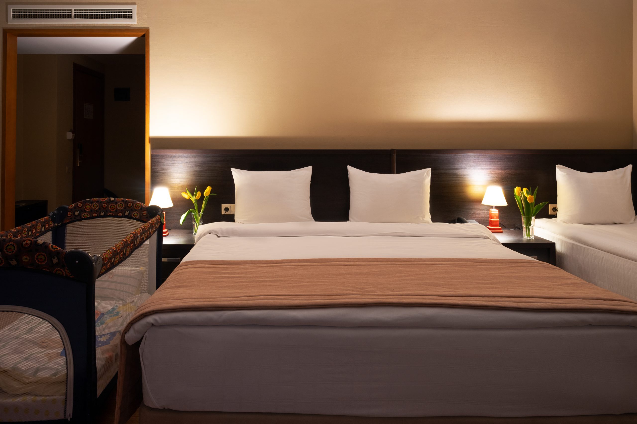 Generous family room with king and single beds, great for families; includes a balcony and optional baby crib.